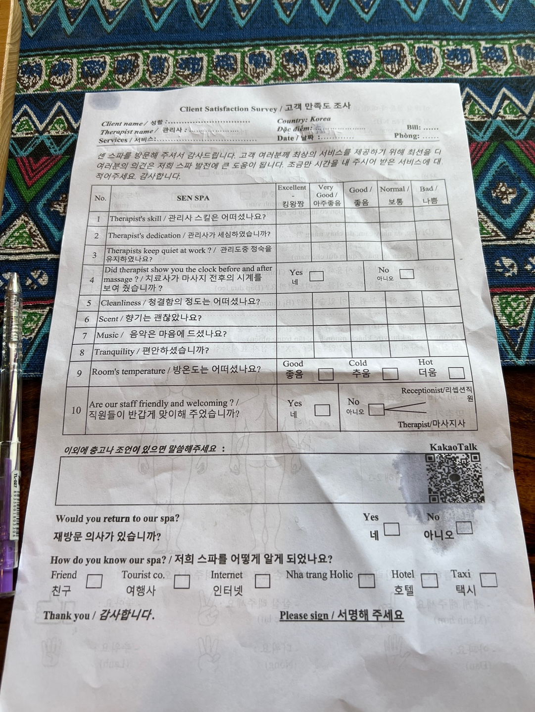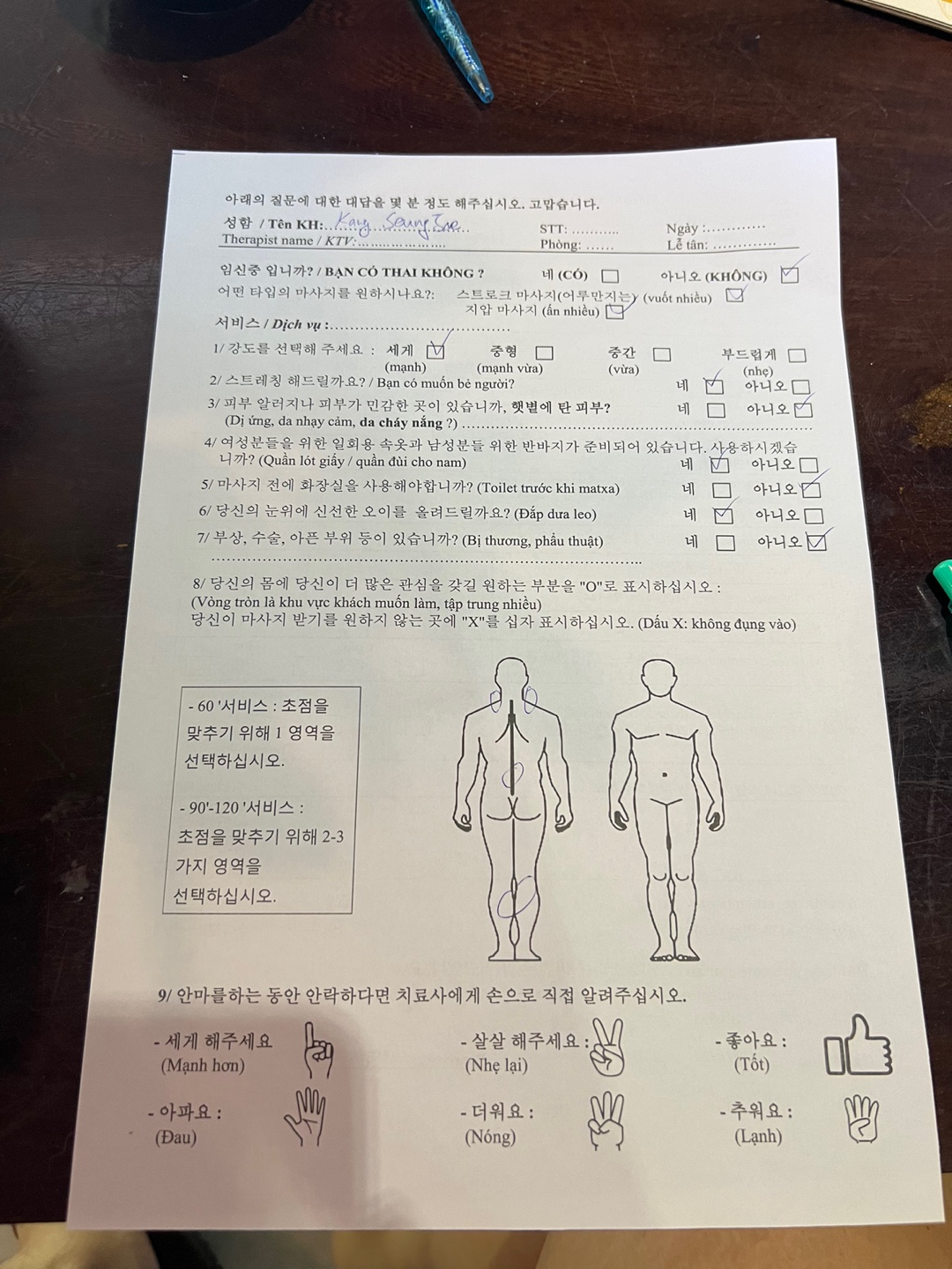 외에 마사지 설문조사표를 주시는데,
