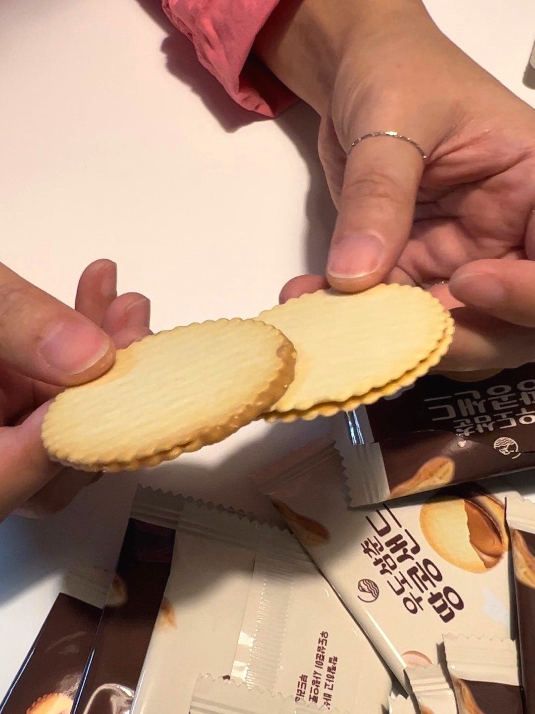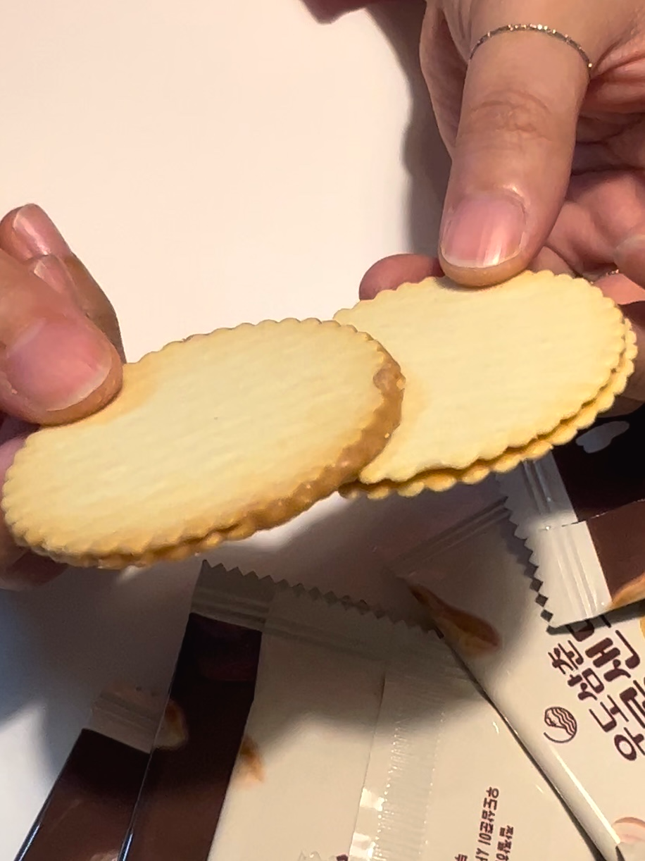과자사이에 땅콩잼이 얇게 발라져 있어서